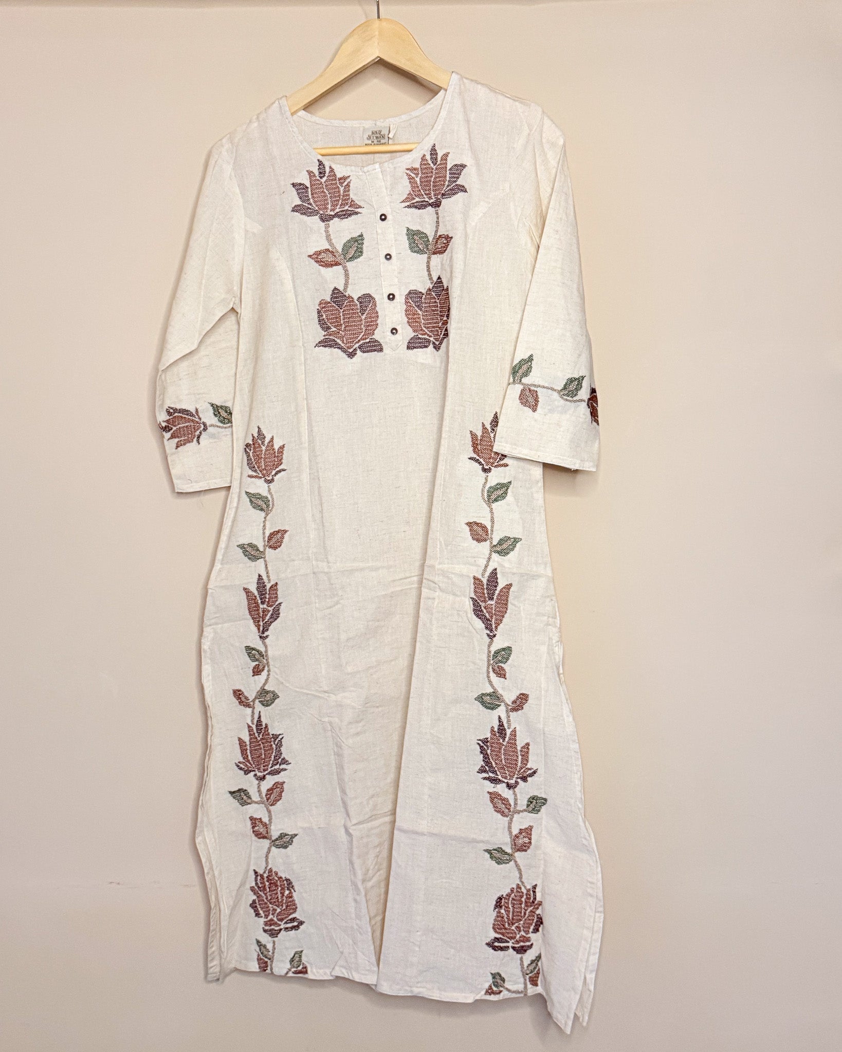 Crafted from breathable khadi fabric, this co-ord set features elegant off-white lotus prints adorning the neckline, adding a subtle yet refined touch. The matching pants come with an elasticated waistband for a comfortable, tailored fit, making it ideal for stylish everyday wear while ensuring ease of movement.