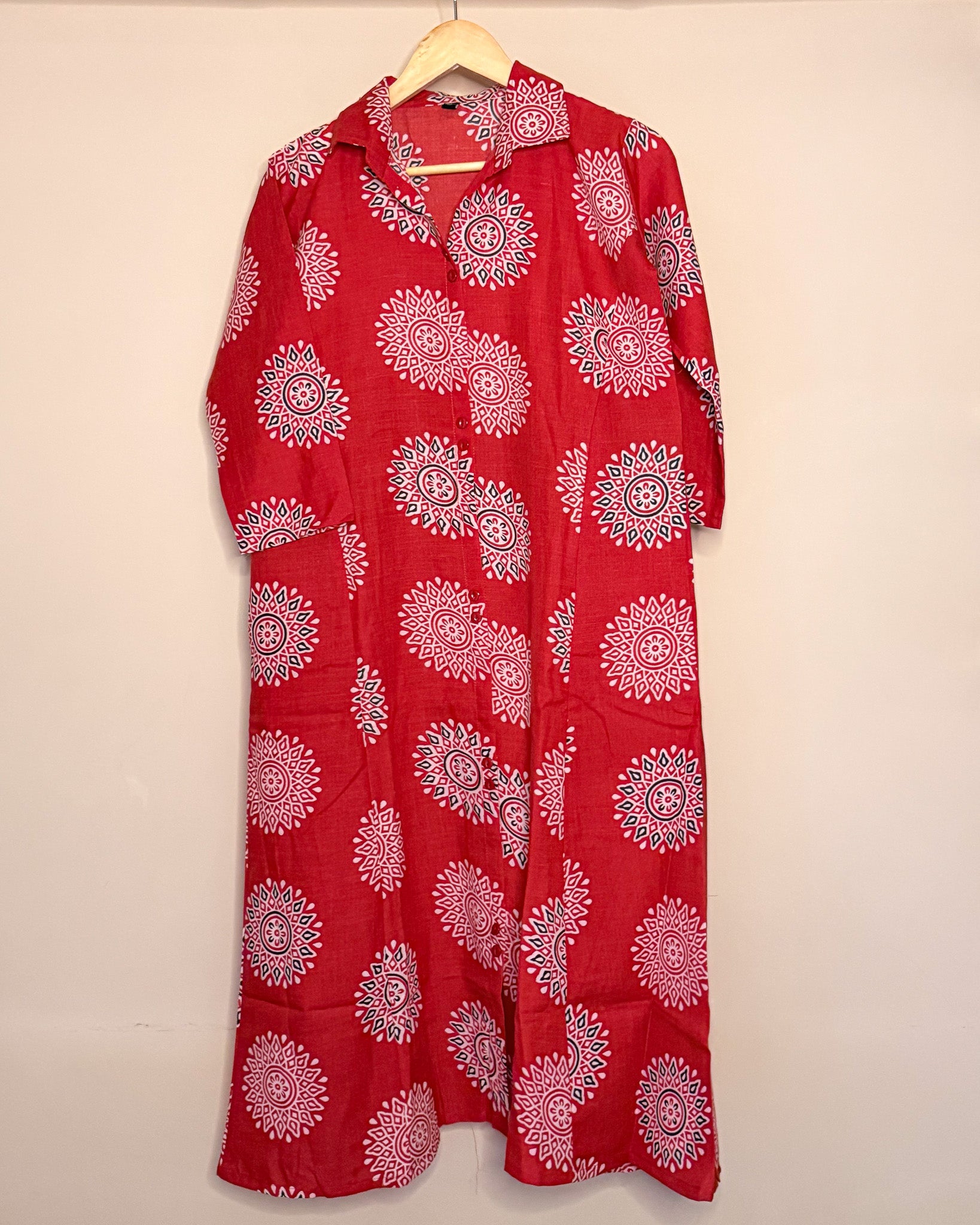 This red mandala design co-ordset showcases a fresh and vibrant look crafted from comfortable fabric. The top features a distinctive collar and a stylish knot detail at the back, adding subtle sophistication. Complemented by matching pants with an elasticated waistband, the set ensures a flattering fit and effortless comfort. Perfect for those who appreciate a blend of traditional mandala artistry with contemporary design and ease.