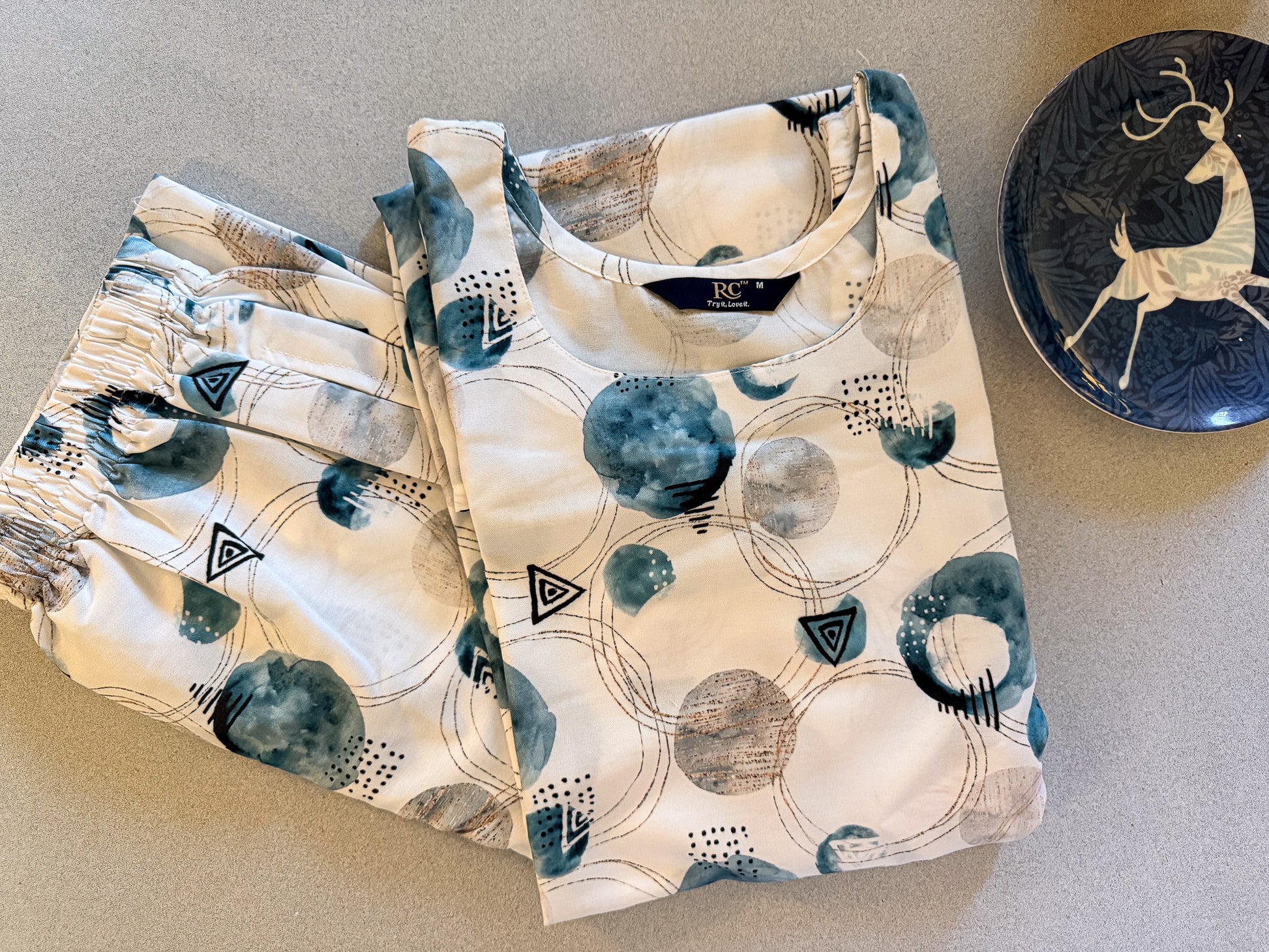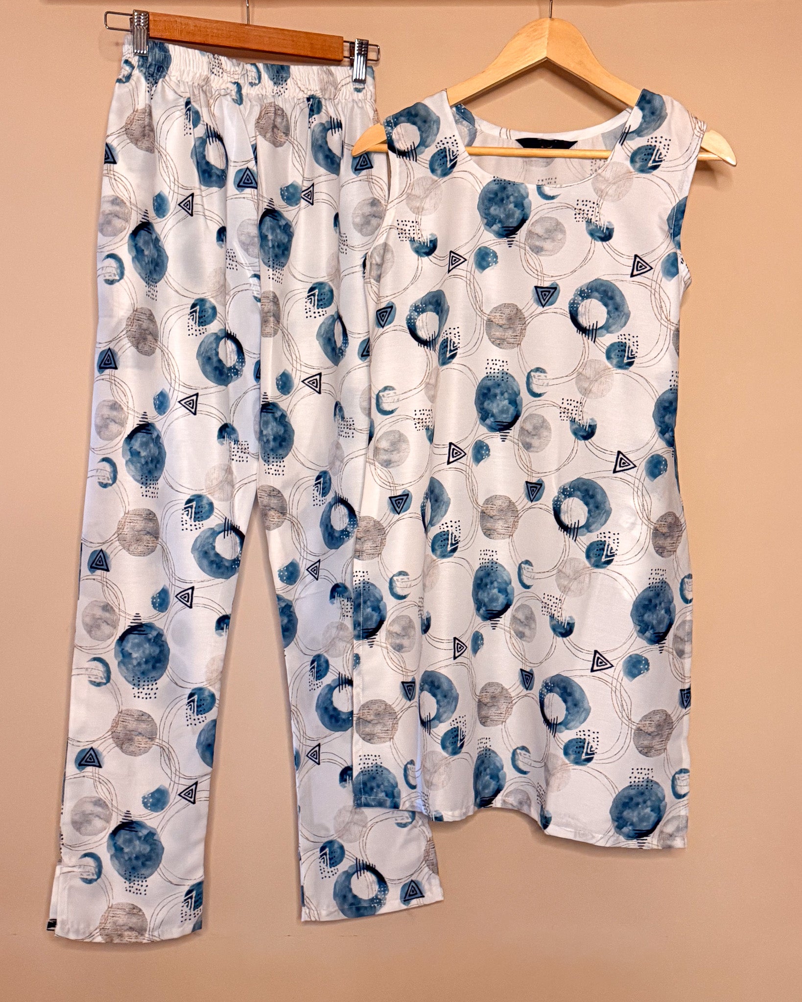 This white co-ord set features a distinctive blue circular design that adds a modern touch to its clean aesthetic. The round neck and sleeveless top (with sleeve inset) offer a sleek, comfortable fit, while the pants include an elasticated waistband for ease and flexibility. Perfect for effortless style and all-day comfort, this set blends contemporary design with practical wearability.