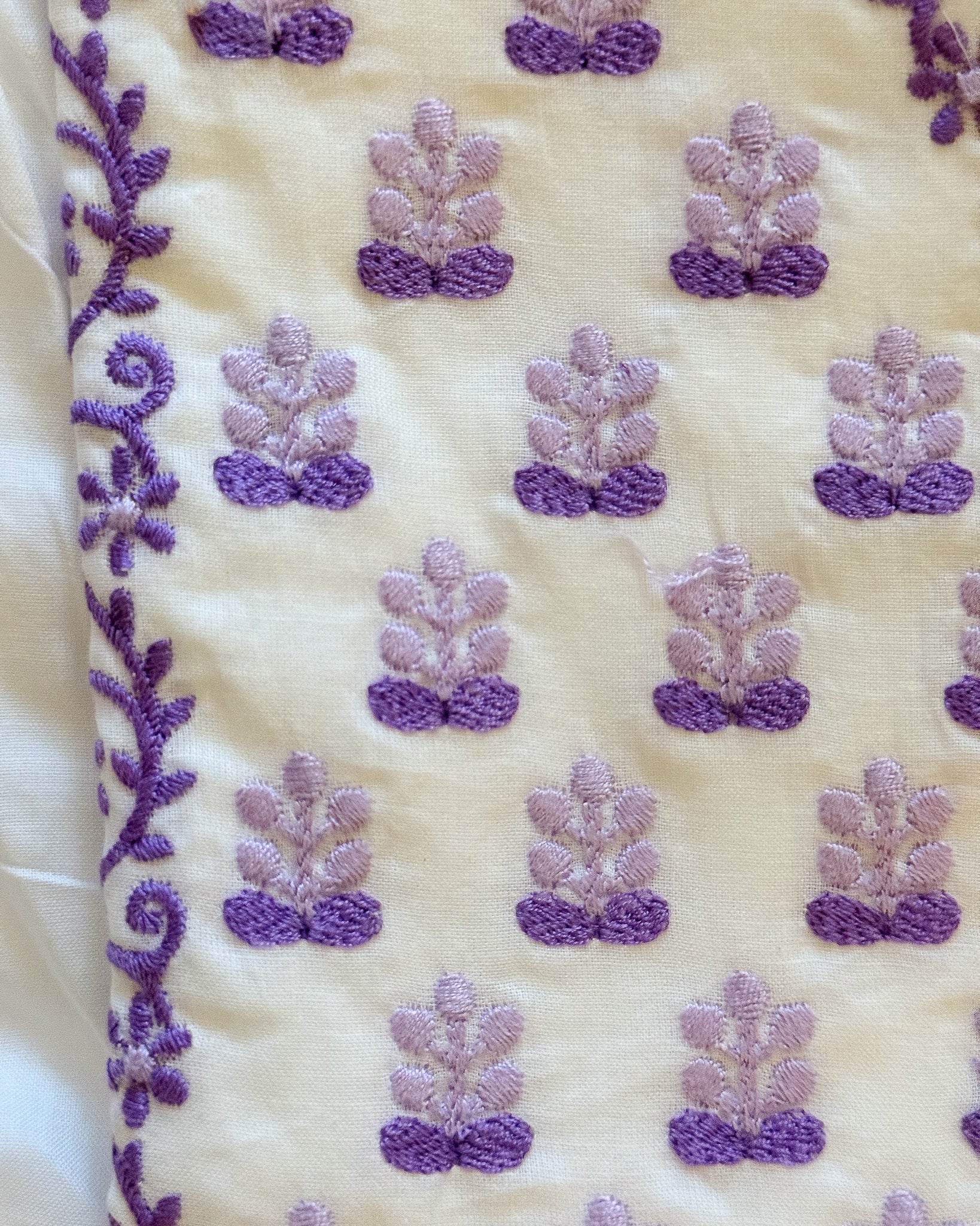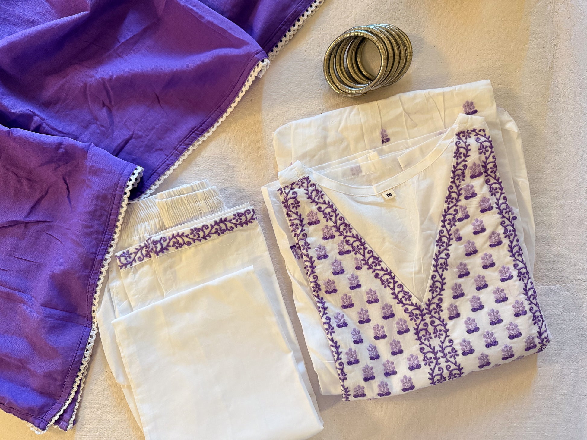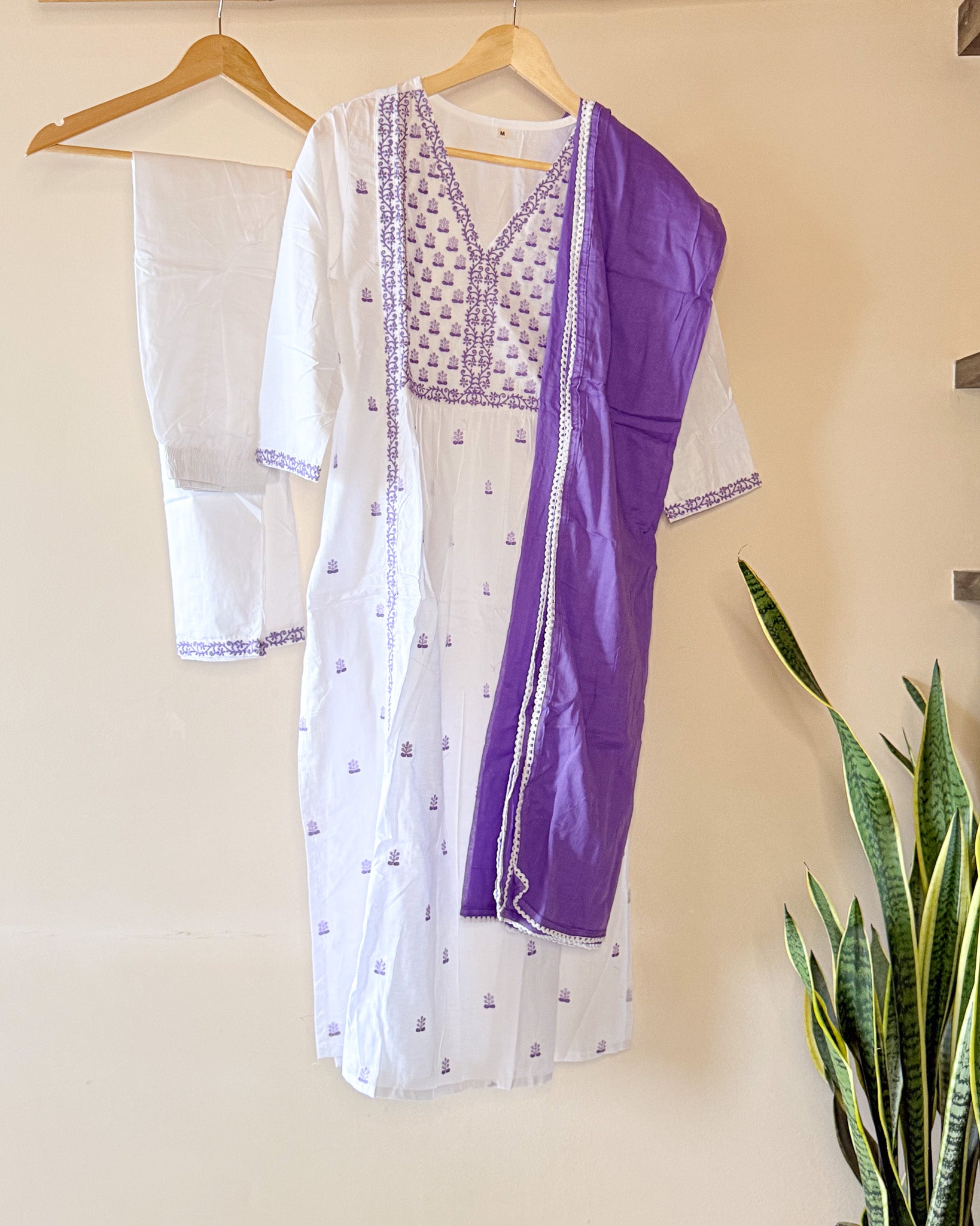 This sophisticated white kurta set features a purple floral design elegantly placed at the neckline, complemented by a matching purple dupatta for a harmonious look. The set is completed with white pants adorned with a subtle design at the bottom, adding a refined detail that enhances the overall ensemble. This outfit offers both comfort and a polished appearance for various occasions.